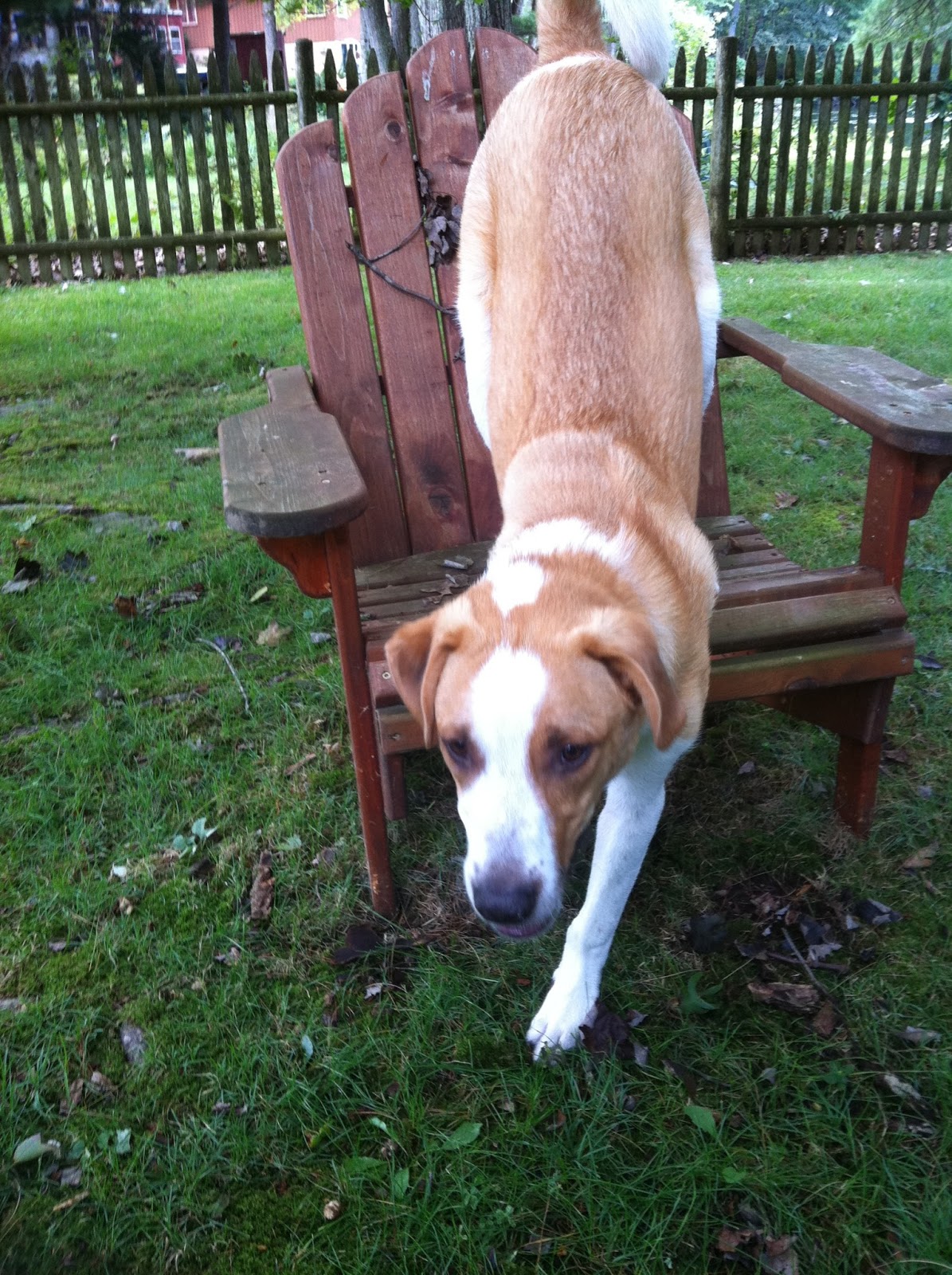 Until recently! You see, the neighbor (who lives on the street BEHIND us and who was, up until recently purportedly… how do I put this nicely? well, “not a dog person” how’s ‘at?) they got a dog! Yup! And where’s the best place to look out the window and spy on the new dog if you’re a k9 in k2’s pack? You guessed it! Blue chair!!